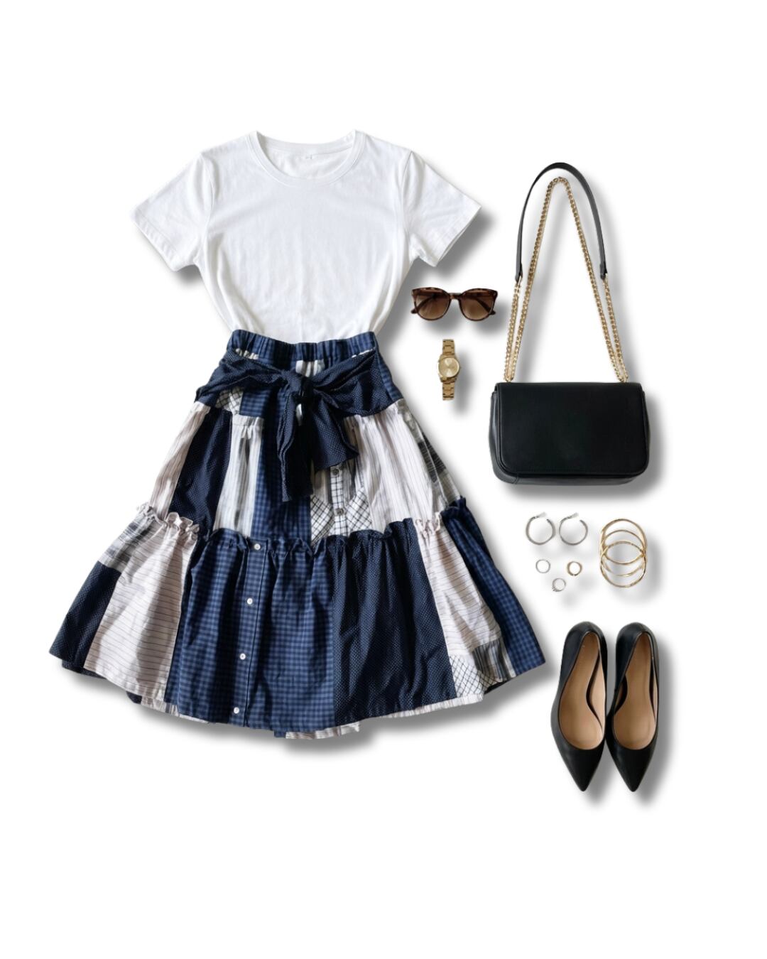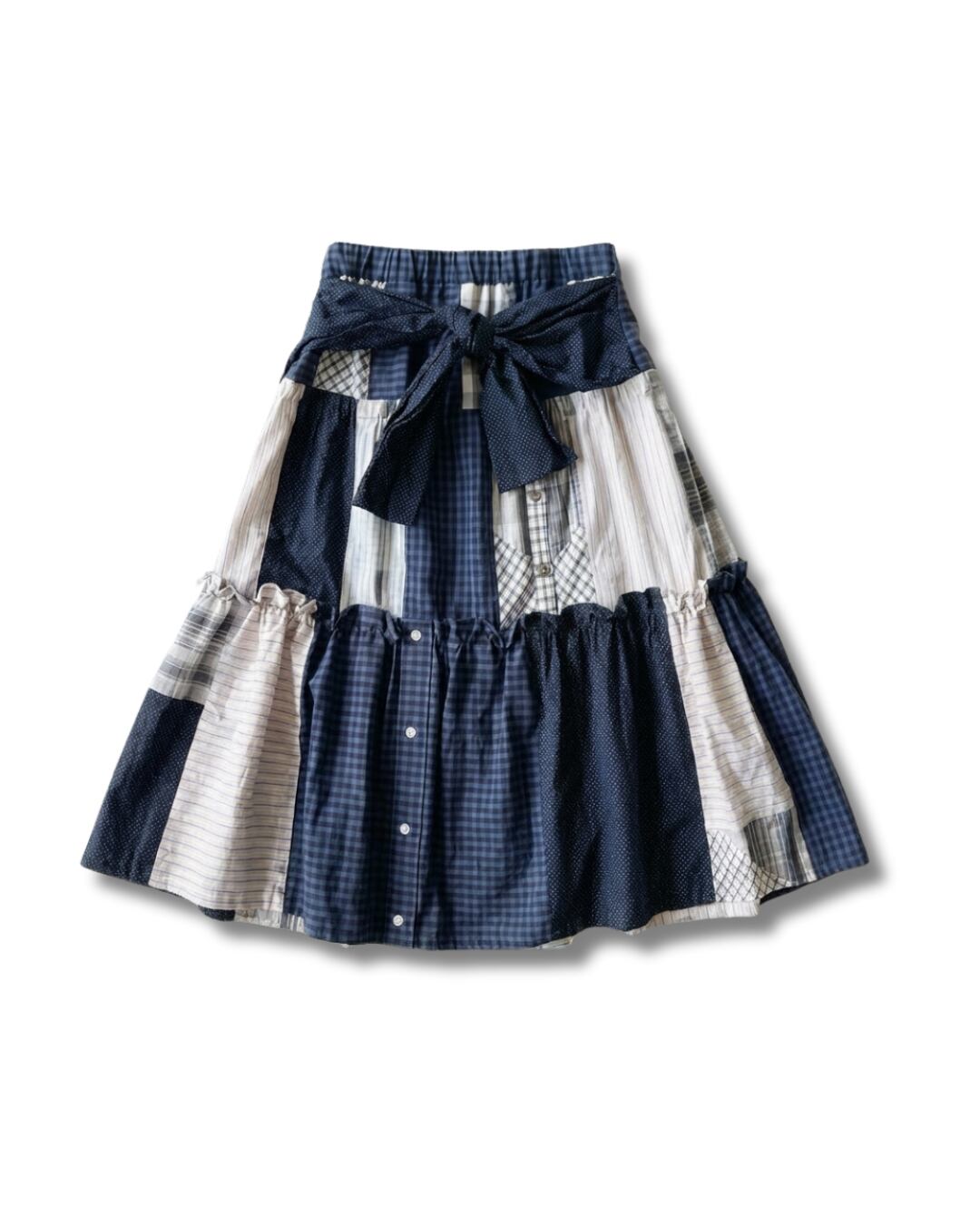 ネイビーとホワイトのチェック・ストライプが織りなす、清潔感あふれる一枚。4枚のシャツから生まれたこのスカートは、知的で洗練された印象を纏います。