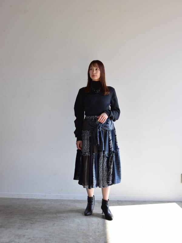 ネイビーとブラックを基調に、水玉とストライプが繊細に混ざり合う大人のスカート。4枚のシャツから生まれたとは思えない、統一感のある洗練されたデザインです。