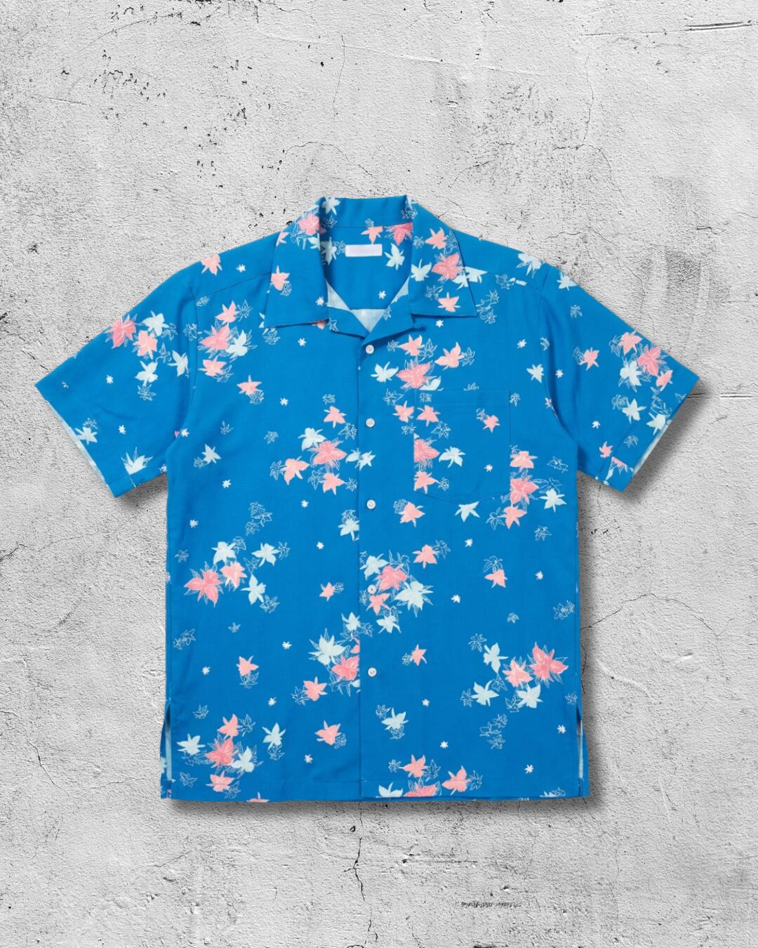 鮮やかなロイヤルブルーの地に、ピンクと白のもみじが軽やかに舞い散る着物柄。日本の秋を象徴する紅葉(もみじ)を大胆にアロハシャツへと仕立てました。伝統的な和の意匠と、陽気なハワイアンスタイルが見事に融合した一着です。