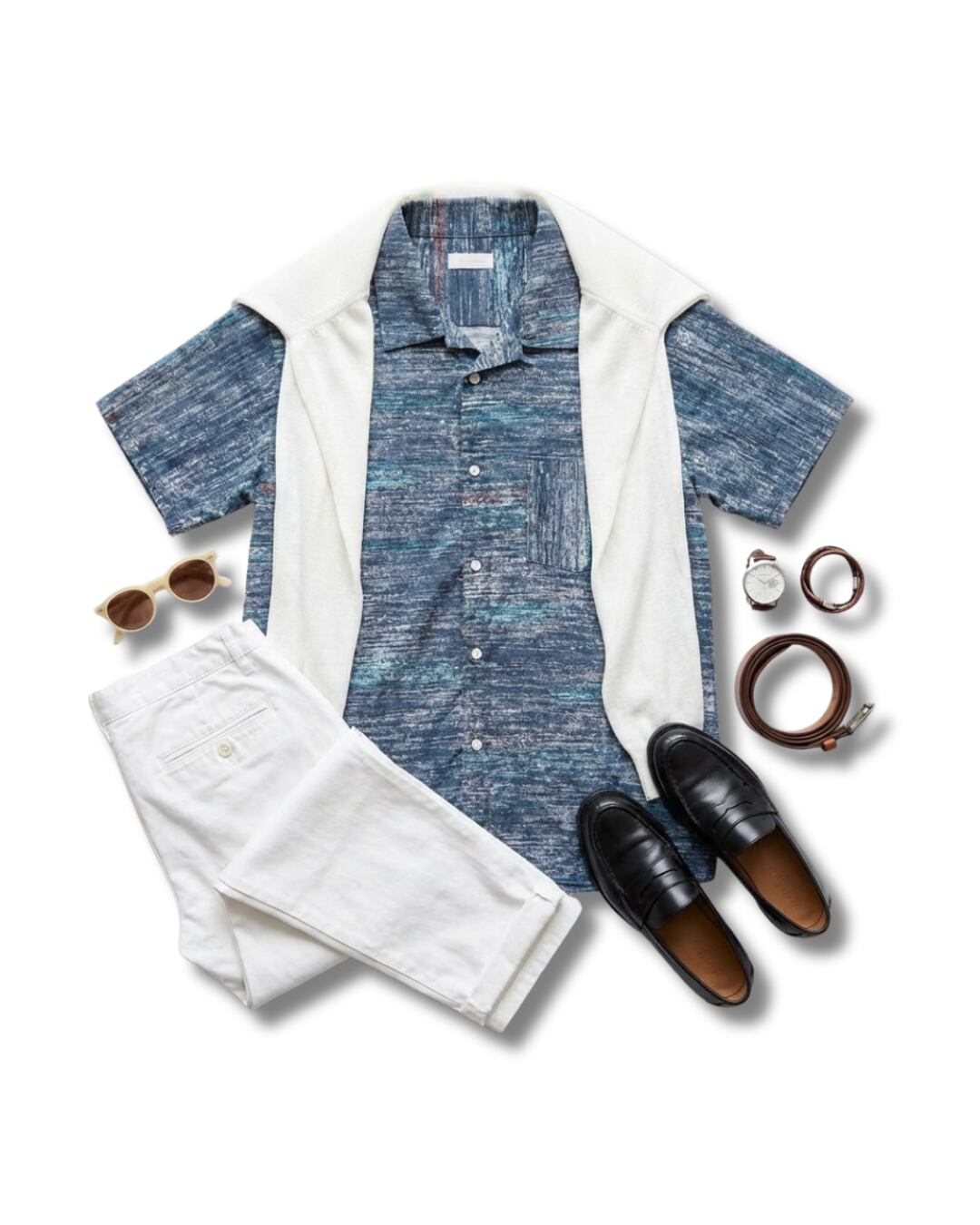 オープンカラー(開襟)仕様で胸元をさらりと開けてリゾートスタイルに。左胸ポケットと、衿裏の切り替えパターンも着物仕立てならではのこだわりです。